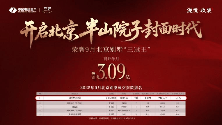 在整体低迷的市场环境中,泷悦·玖宸的业绩表现堪称亮眼。项目于9月首次开盘,便在北京别墅市场引起强烈反响。短时间内实现网签金额3.09亿元,一举斩获当月北京别墅市场在成交套数、成交面积、成交金额三个核心维度的冠军,成就“三冠王”业绩。