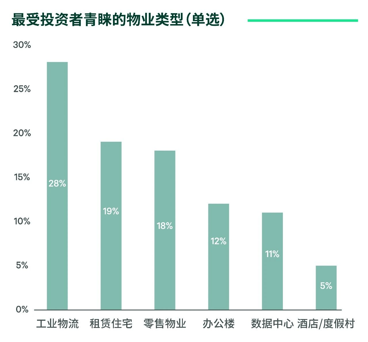 在另类资产方面,投资者偏好发生显著变化。学生公寓因国内高等教育生均宿舍面积供需缺口大,上升至关注度榜首。基础设施和生命科学地产分居第二和第三位。