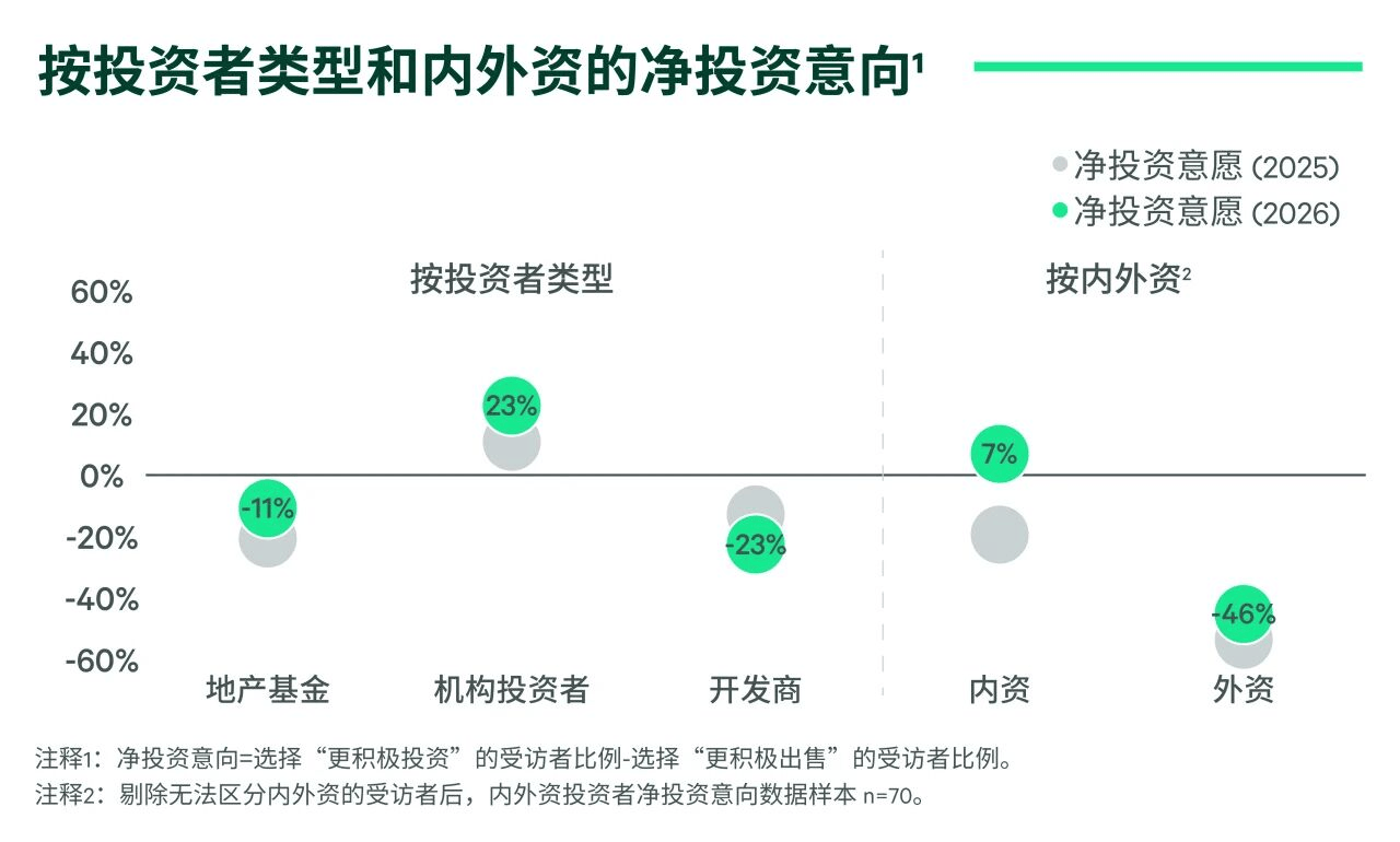 尽管整体市场仍以净出售为主导,但不同类型投资者的意向呈现分化趋势:机构投资者与地产基金的净投资意向有所回升,开发商受限于流动性压力,净出售意愿较上年进一步走强。分内外资看,在机构投资者和地产基金的推动下, 2026 年内资投资者净投资意向由负转正,而外资继续呈现净出售意愿。