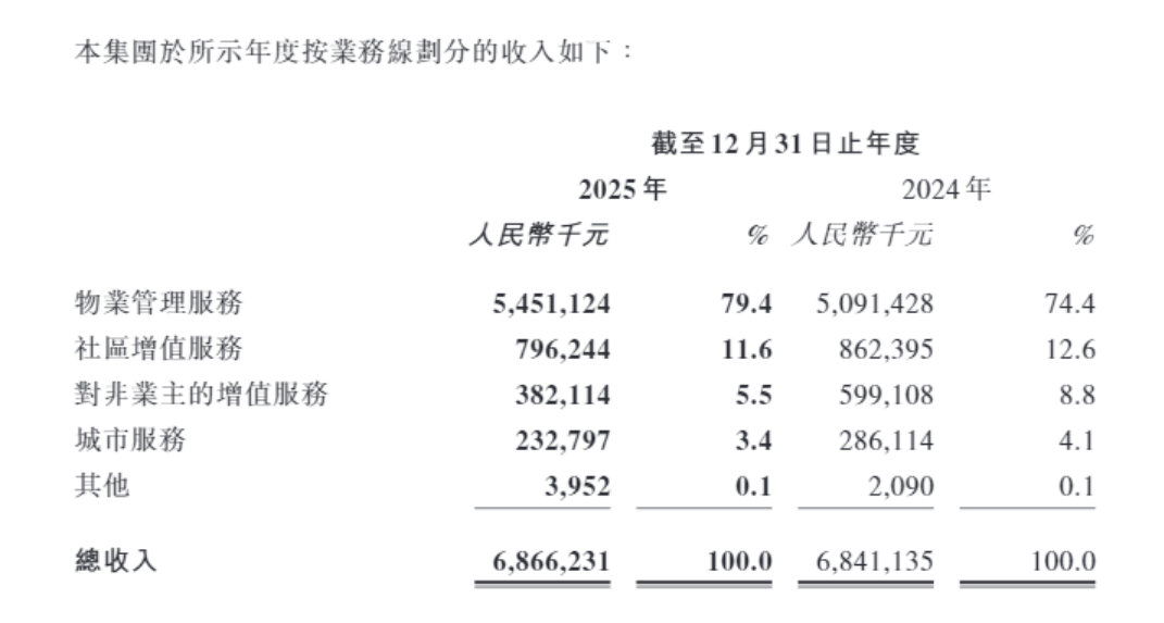 不过,除物业管理服务实现增长外,公司其余三大业务板块收入均出现下滑。其中,社区增值服务降幅最小,实现收入7.96亿元,同比下降7.7%;城市服务实现收入2.33亿元,同比下降18.7%;非业主增值服务收入降幅最大,实现收入3.82亿元,同比下降36.2%,较2024年减少了2.17亿元,占公司总营收的比重降至5.5%。