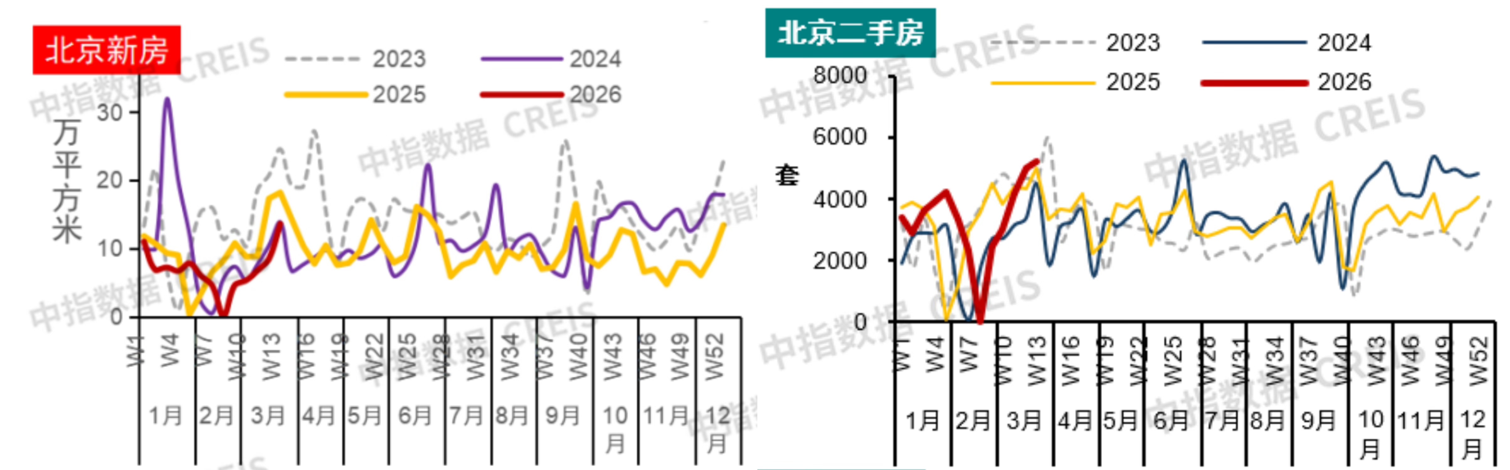 不过对比过往同期行情,2026年3月的楼市成交并不显著突出。根据中指研究院,3月以来北京一手住宅周度成交面积低于2025年同期,3月(截至29日)二手住宅成交17389套,与去年基本持平,全月预计小幅增长。